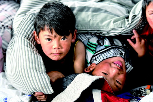 5月22日,在玛多县黄河乡寄宿制学校救灾安置点,孩子们在休息。       新华社记者张龙摄