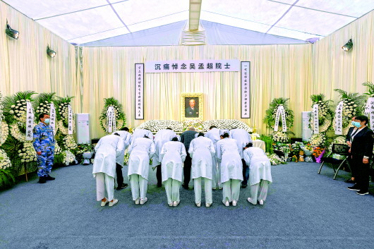 记者在追思活动现场看到,这里庄严、肃穆。灵堂中央一副挽联让人对吴院士的一生钦佩不已:一代宗师披肝沥胆力拓医学伟业,万众楷模培桃育李铸就精诚大医。