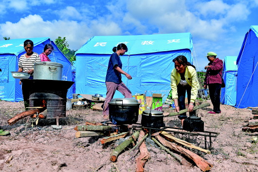 5月23日,在漾濞县苍山西镇秀岭村一处安置点,受灾村民在做饭。 新华社记者陈欣波摄
