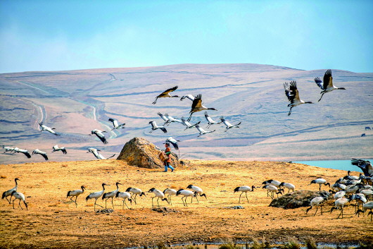 每年10月底,黑颈鹤都会飞到大山包越冬,次年3月下旬陆续离开,返回繁殖地。