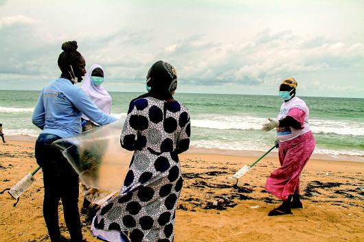 4月27日,在尼日利亚拉各斯的一处海滩,"海龟妈妈"奥耶容可·阿德格比勒(左一)带领当地民众开展海滩垃圾清理活动。新华社记者郭骏摄 |