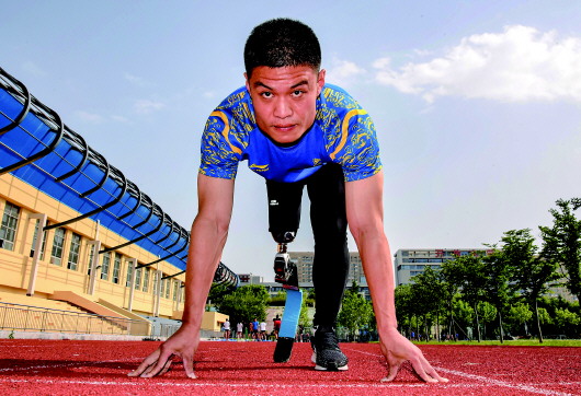 右图:5月24日,李茂大换上跑步专用假肢开始训练。 均为新华社记者李紫恒摄