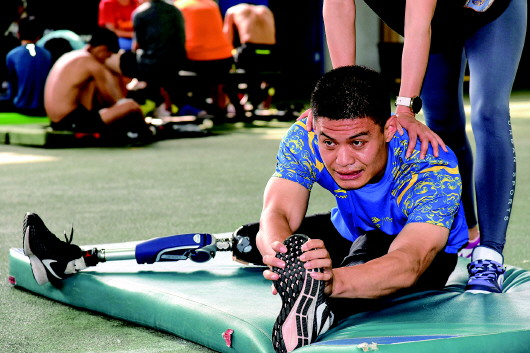 训前拉伸、慢跑热身、专项训练、力量辅助……在教练吴艳英的指导和辅助下,青岛市残疾人体育中心田径队队员李茂大先是进行了充分热身,然后进行了专项短跑训练和力量辅助训练。