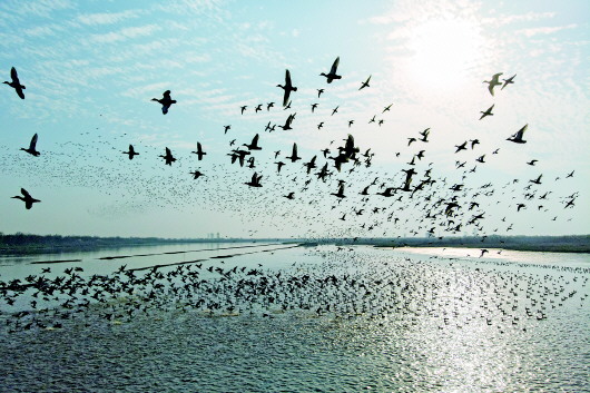 成群罗纹鸭在湖南西洞庭湖国家级自然保护区飞翔(2020年11月11日摄,无人机照片)。