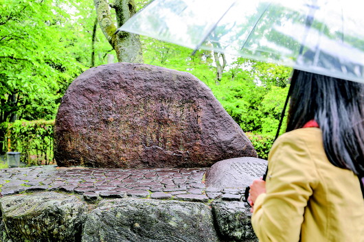 记者从位于岚山脚下的龟山公园拾级而上,看到樱花树环抱之中一座风貌古朴的纪念碑——“周恩来总理纪念诗碑”。诗碑由日本国际贸易促进会等中日友好团体提议建造而成,碑身正面镌刻着廖承志手书的《雨中岚山》,背面铭刻着为建碑作出贡献的团体和代表的名字。