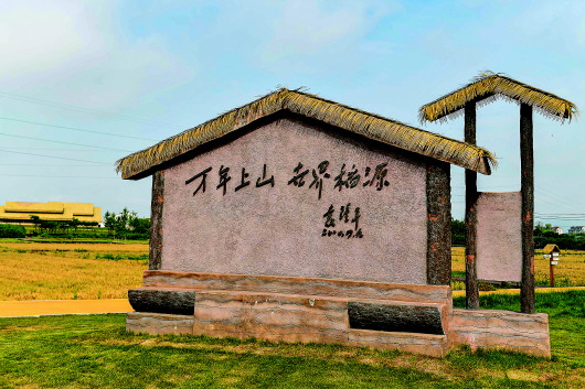 在上山考古遗址公园拍摄的袁隆平院士题词——“万年上山 世界稻源”(5月12日摄)。