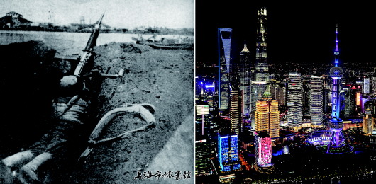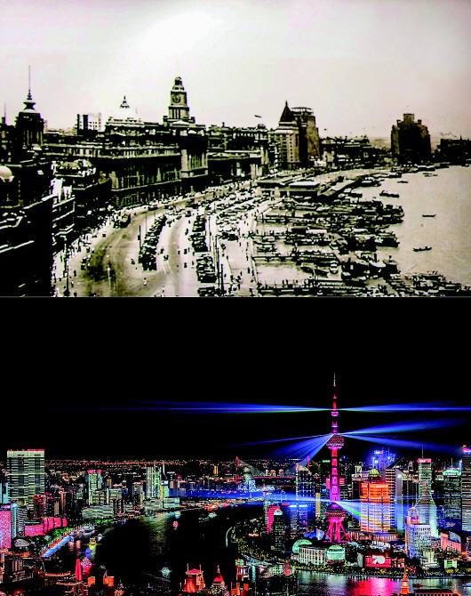拼版照片:左图为解放前的上海外滩;右图为上海浦江两岸灯光璀璨(2019年9月18日新华社记者任珑摄)。