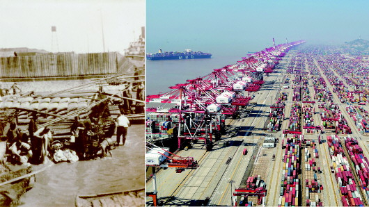 拼版照片:左图是解放前的上海烂泥渡货运码头(资料照片);右图是2020年3月18日拍摄的上海洋山港集装箱码头(新华社记者丁汀摄)。