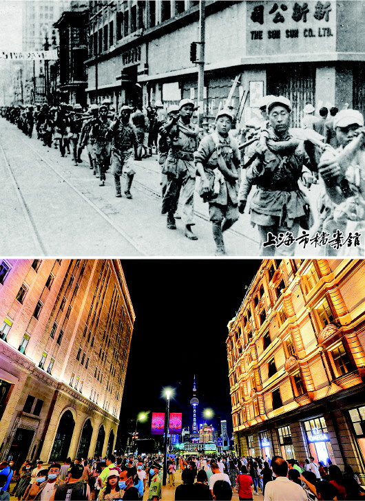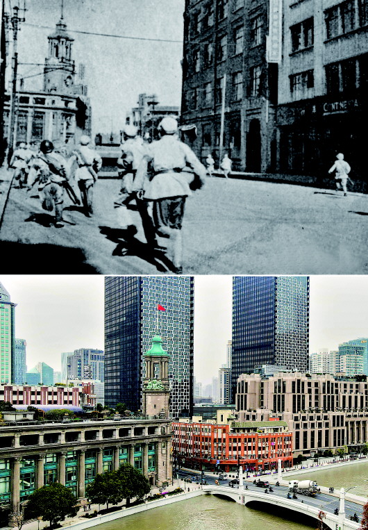 拼版照片:上图为解放军向上海邮政总局大楼里的残敌进攻;下图为2020年12月29日拍摄的上海邮政大楼(新华社记者方喆摄)。 新华社发 |