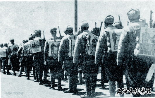 进入上海前,解放军将《入城守则和纪律》印成图片,挂在战士们的背包上,一边行军一边学习(资料照片)。 新华社发 |