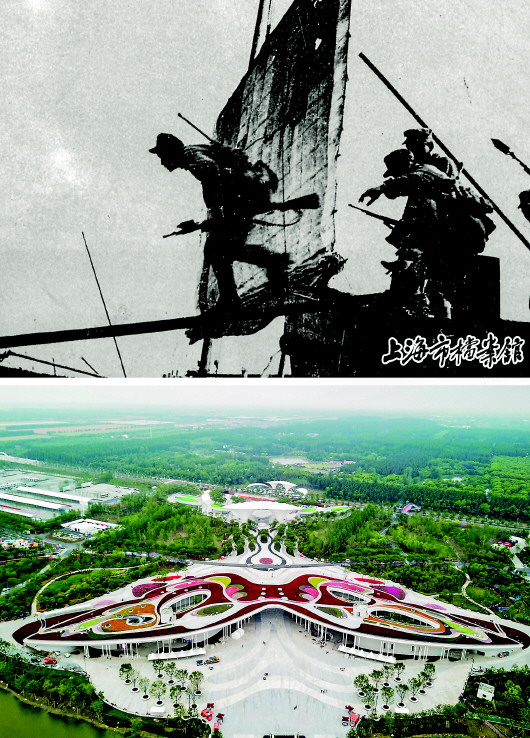 拼版照片:上图是渡江战役中解放军冒着敌人的炮火渡江;下图是2021年5月20日拍摄的位于上海崇明的中国花卉博览会主场馆之一的世纪馆(新华社记者丁汀摄)。