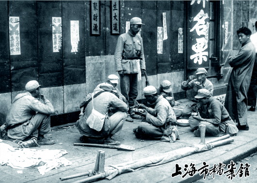 进入上海后,解放军严守纪律,不入民房,在街边吃饭(资料照片)。新华社发 |