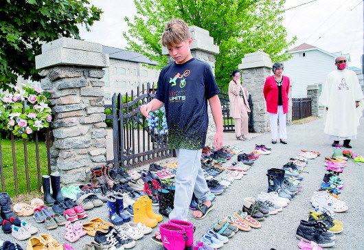 5月30日,一名儿童在加拿大卡纳韦克走过代表死亡儿童的童鞋。当日,加拿大多地举行活动,悼念不列颠哥伦比亚省坎卢普斯市一所原住民寄宿学校的死者。据加拿大媒体28日报道,215具原住民儿童遗骸在“坎卢普斯印第安寄宿学校”旧址上被发现。   新华社发