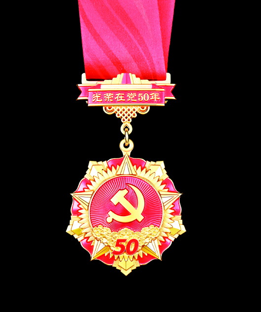 “光荣在党50年”纪念章通径为50毫米,材质为铜和锌合金,主色调为红色和金色。主章由党徽、五角星、旗帜、丰碑、向日葵、光荣花、光芒等元素构成,其中党徽象征党的领导核心地位和党员信念坚定、对党忠诚;丰碑寓意党的光辉历程和丰功伟绩;向日葵寓意全党全国各族人民紧密团结在党中央周围;光芒象征党的光辉照耀;五角星代表薪火相传;光荣花寓意繁荣盛世、国泰民安和褒奖荣耀;旗帜象征共产主义崇高理想与事业永续。副章由山河、中国结和红飘带等元素组成,飘带上雕有“光荣在党50年”字样,寓意党员不忘初心、牢记使命,勇攀高峰、永葆青春。