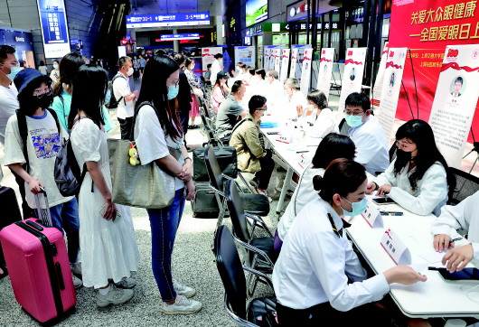 旅客在上海虹桥火车站候车大厅等待咨询义诊医生。在第26个全国爱眼日,上海交大医学院附属第九人民医院眼科党支部与虹桥火车站党总支联合开展义诊活动,眼科专家现场为旅客提供义诊、眼部检查和眼健康科学知识宣讲等服务。新华社记者陈飞摄