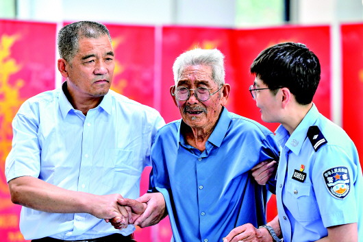 | 6月8日,在“认亲,我们在行动”济南主会场,被拐58年的罗亚军(左)搀扶着90岁高龄的父亲罗凤坤。