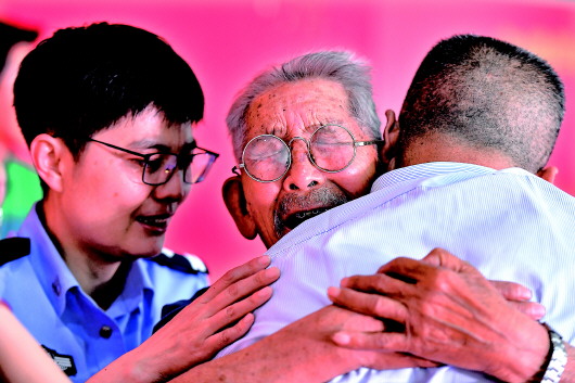 6月8日,在“认亲,我们在行动”济南主会场,90岁高龄的罗凤坤(中)紧搂着被拐58年的儿子罗亚军哭泣。