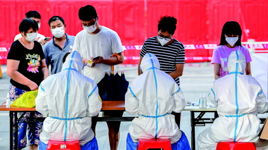 6月8日,在广州荔湾区白鹤洞街广钢新城,居民在核酸检测前进行信息登记。当日,广州对高风险地区白鹤洞街、中南街开展新一轮全员核酸检测。 新华社记者邓华摄