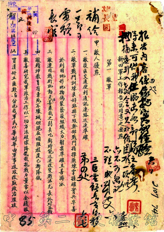 在中国第二历史档案馆馆藏军事档案中,与新四军相关的档案尤为丰富。从1938年4月在皖南岩寺组建成军、接受国民政府第三战区的点验,随即奉延安命令开赴苏皖敌后作战;到1941年1月皖南事变爆发前,新四军在这两年多的时间内不断向国民政府军事委员会、军令部、第三战区报告敌情,以及其在敌后对日伪军、叛军等大小战役作战的战况。初步统计约有1130余件电函及报告文档,总页数超过3000页。