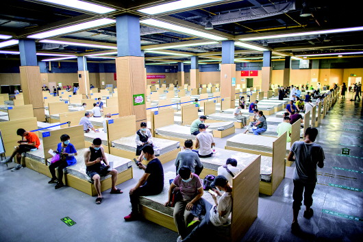 6月9日,市民在武汉江夏方舱医院接种新冠疫苗后留观休息。