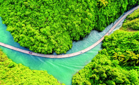 5月2日,游客在湖北省恩施土家族苗族自治州宣恩县狮子关景区水上栈道驾车游玩(无人机照片)。 新华社发(王俊摄)