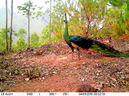 2016年4月1日,通过红外线照相机拍摄到的野生绿孔雀。云南省景谷县森林公安局供图