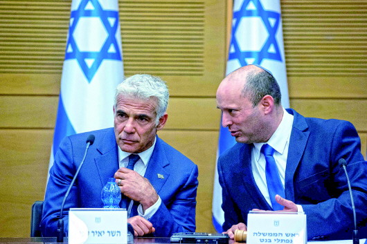 6月13日,以色列新任总理贝内特(右)和候补总理兼外交部长拉皮德在耶路撒冷参加新一届政府第一次内阁会议。 新华社发
