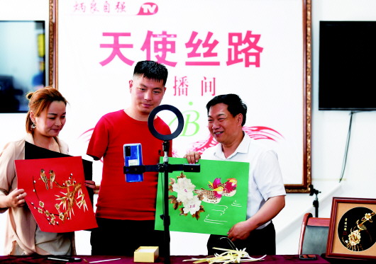 孙炳良(右)在公司直播间帮助销售残疾人员工自制的工艺品(六月四日摄)。 新华社记者张浩然摄
