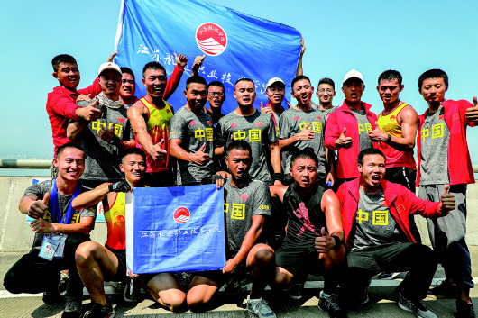 2019年6月28日,浙江舟山,闫超动(后排左五)和同学们代表江苏航运职业技术学院在第五届中国海员技能大比武上获得团体一等奖,这是该校参赛队员合影。 受访者闫超动供图 |