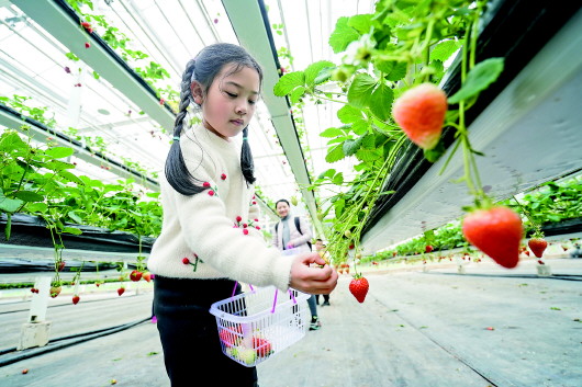 在南京市溧水区傅家边精品草莓生活馆,游客在采摘草莓。