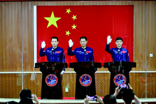 6月16日,神舟十二号载人飞行任务航天员聂海胜(中)、刘伯明(右)和汤洪波在酒泉卫星发射中心与记者见面。