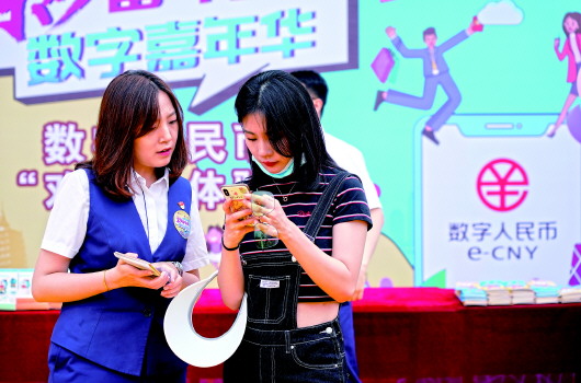 6月16日,交通银行北京市分行的工作人员(左)引导游客李女士开通数字人民币钱包。当日,数字人民币体验活动在北京欢乐谷游乐园举行。交通银行北京市分行工作人员向游客介绍数字人民币相关知识,引导游客下载数字人民币应用程序、开通数字人民币钱包,部分游客还在园内使用数字人民币消费。