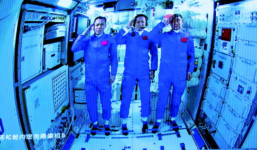 6月17日在北京航天飞行控制中心拍摄的进驻天和核心舱的航天员向全国人民敬礼致意的画面。