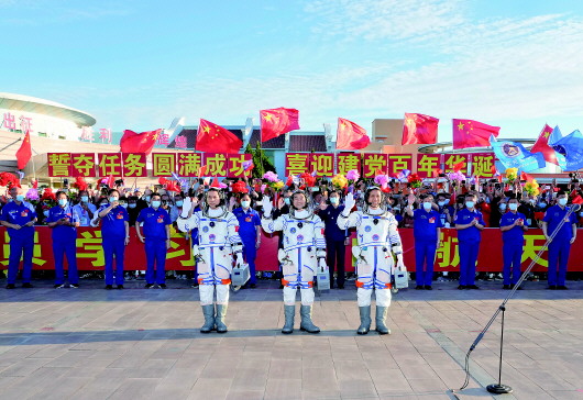 6月17日,神舟十二号航天员聂海胜(右)、刘伯明(中)和汤洪波在出征仪式上挥手。 新华社记者李刚摄