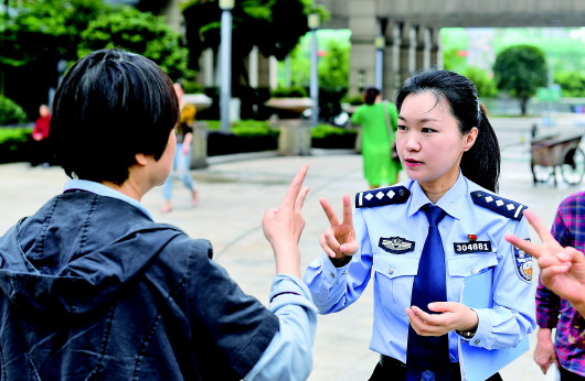 4月27日,重庆市沙坪坝区磁器口派出所警长兼磁建村社区民警何巧(右)与磁建村社区的聋哑群众进行手语交流。 新华社记者王全超摄