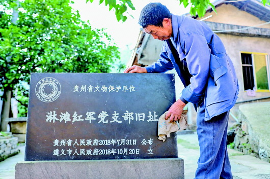 4月21日,宋加通的儿子宋光平在擦拭家门前的“淋滩红军党支部旧址”石碑。