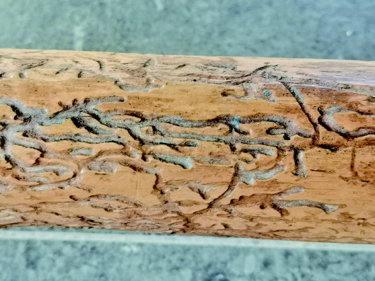 书桌木头上的虫文。 图片由作者提供