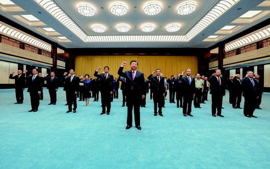 六月十八日,党和国家领导人习近平、李克强、栗战书、汪洋、王沪宁、赵乐际、韩正、王岐山等在中国共产党历史展览馆参观“‘不忘初心、牢记使命’中国共产党历史展览”。这是参观结束后,习近平带领党员领导同志一起重温入党誓词。