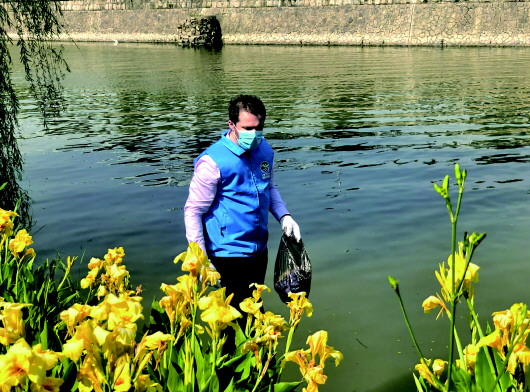 河边是否有垃圾、水面是否有漂浮物、水质是否有变化、沿岸是否存在非法排污……何诺对巡河中的观察要点很是“门清”。这位金发碧眼的法国大叔,身穿“河湖监督员”蓝马甲,手拎环保垃圾袋,快步于河堤上,这身装扮常引得不少行人回头。