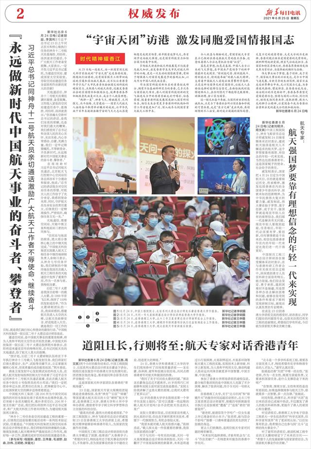 23日起,国家航天专家大规模组团陆续走进香港校园。负责“神舟”“长征”“嫦娥”等国家重大航天项目的6位“硬核”航天专家,赴香港理工大学、香港大学和6所中学举办讲座,激励青年学子树立科学梦想和自立自强的科技自信。