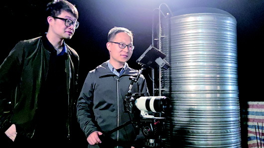 《我的朋友是党员》导演杨定都与主创眭黎曦在广西扎洞村夜间采访拍摄。