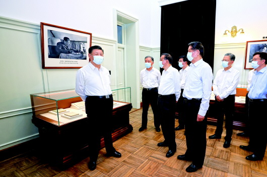 25日下午,习近平带领中央政治局同志来到北大红楼,参观“光辉伟业 红色序章——北大红楼与中国共产党早期北京革命活动主题展”,重温李大钊、陈独秀等开展革命活动、推动马克思主义在中国早期传播、酝酿和筹建中国共产党等革命历史。展厅内,一张张图片、一件件文物,全面展现了那个时期的光辉历史。习近平不时停下脚步,询问相关细节。他指出,北大是新文化运动的中心和五四运动的策源地,最早在我国传播马克思主义思想,也是我们党在北京早期革命活动的历史见证地,在建党过程中具有重要地位。要加强红色资源保护和利用,尊重历史事实,准确评价历史,正确学史用史。