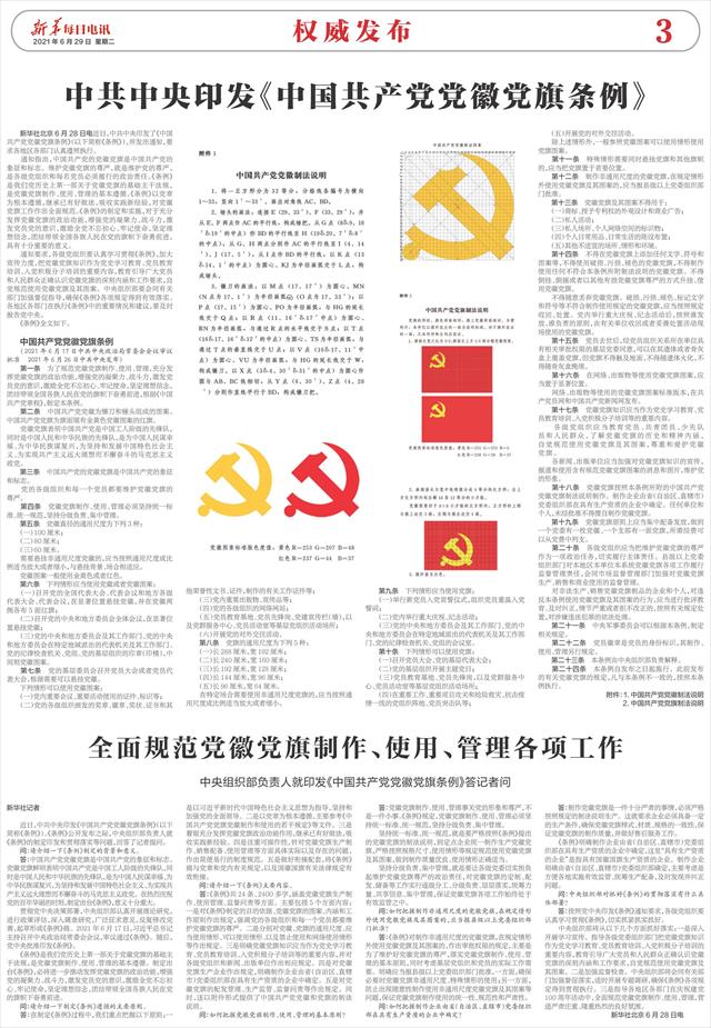 新华社北京6月28日电近日,中共中央印发了《中国共产党党徽党旗条例》(以下简称《条例》),并发出通知,要求各地区各部门认真遵照执行。