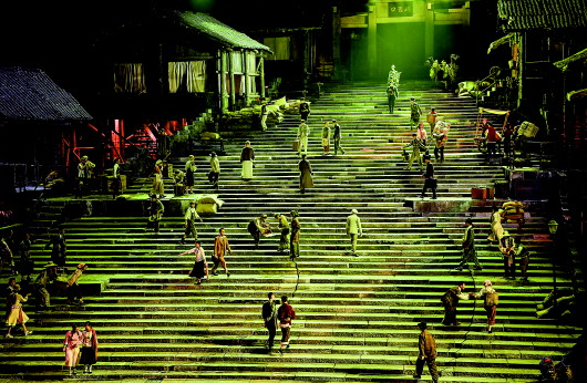 灯光亮起,舞台连同观众席一起旋转飞升,磁器口、吊脚楼、长梯坎,甚至嘉陵江都在身边,仿佛触手可及……像按动了时空穿梭的按钮,人们仿佛回到了1949年解放前夕的重庆。没有传统意义上的舞台,演员就在观众身边演出。这是真正的沉浸式表演,观众们被震撼了,全场不断响起雷鸣般的掌声……
