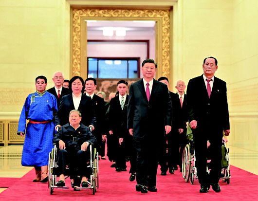 ![]() 6月29日,庆祝中国共产党成立100周年“七一勋章”颁授仪式在北京人民大会堂金色大厅隆重举行。中共中央总书记、国家主席、中央军委主席习近平同“七一勋章”获得者一同步入会场。 新华社记者李涛摄 |