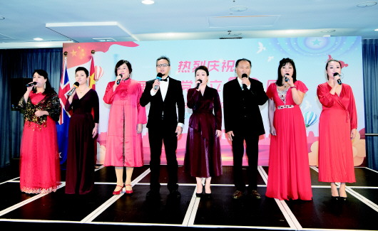 中国共产党迎来百年华诞之际,表演者在中国驻新西兰奥克兰总领馆举行的庆祝中国共产党成立100周年招待会上演唱中新两国国歌。新华社发(孙学良摄)