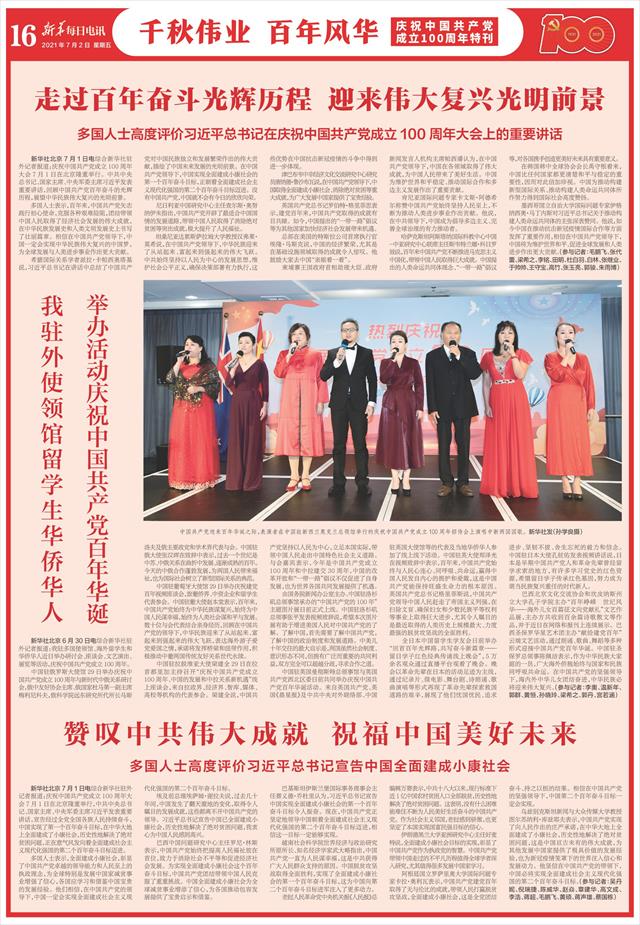 新华社北京6月30日电综合新华社驻外记者报道:我驻多国使领馆、海外留学生和华侨华人近日举办研讨会、座谈会、文艺演出、展览等活动,庆祝中国共产党成立100周年。