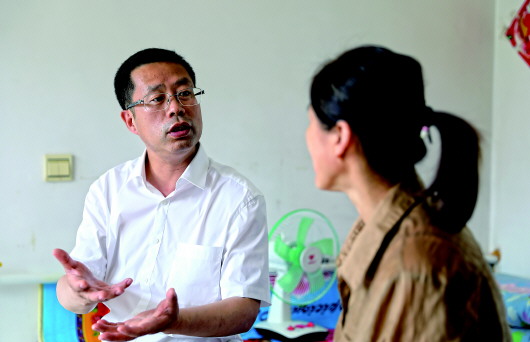 7月2日,在沈阳市沈北新区兴隆台街道单家村,闻然(左)与村民交谈。 新华社记者杨青摄
