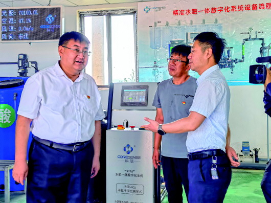 6月23日,刘伟(左一)在太谷区闫村科芯园区水肥一体化车间调研。 新华社发