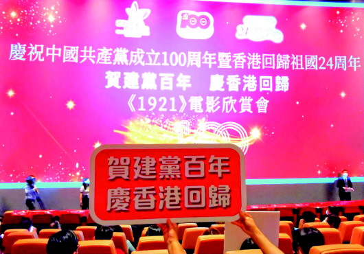 7月1日,建党百年的大日子和香港回归祖国24周年的好日子赶在了一起。热烈喜庆的气氛中,建党100周年献礼影片《1921》在香港多家影院首映,不少团体抢先包场,先睹为快。